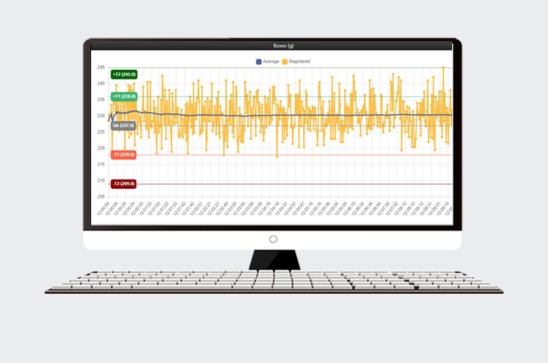 The e-mark module is a smart software package and an extension of the cloud data manager software. The software has been approved by the NMi. This means that companies are permitted to weigh based on an average weight (e-mark) per batch.
